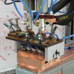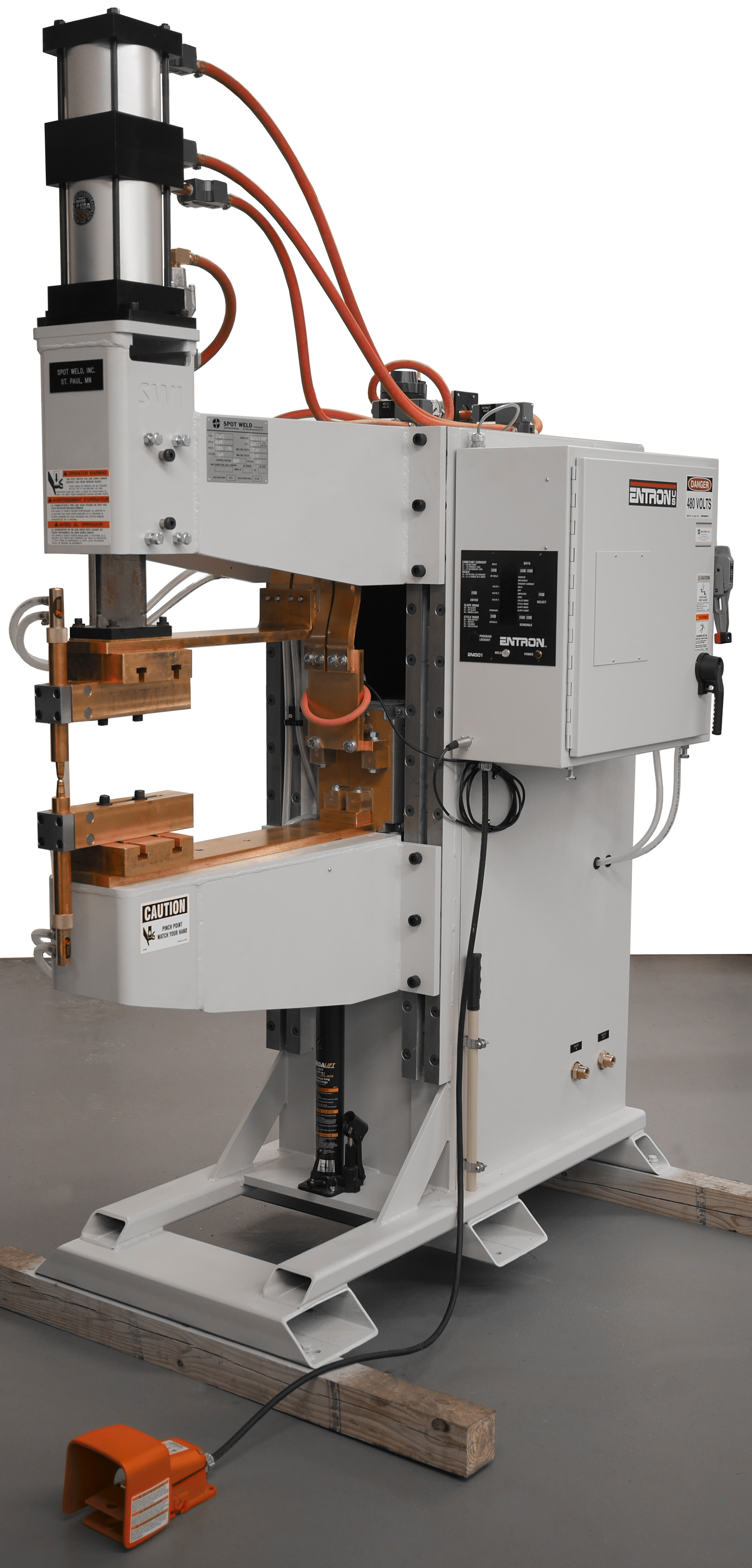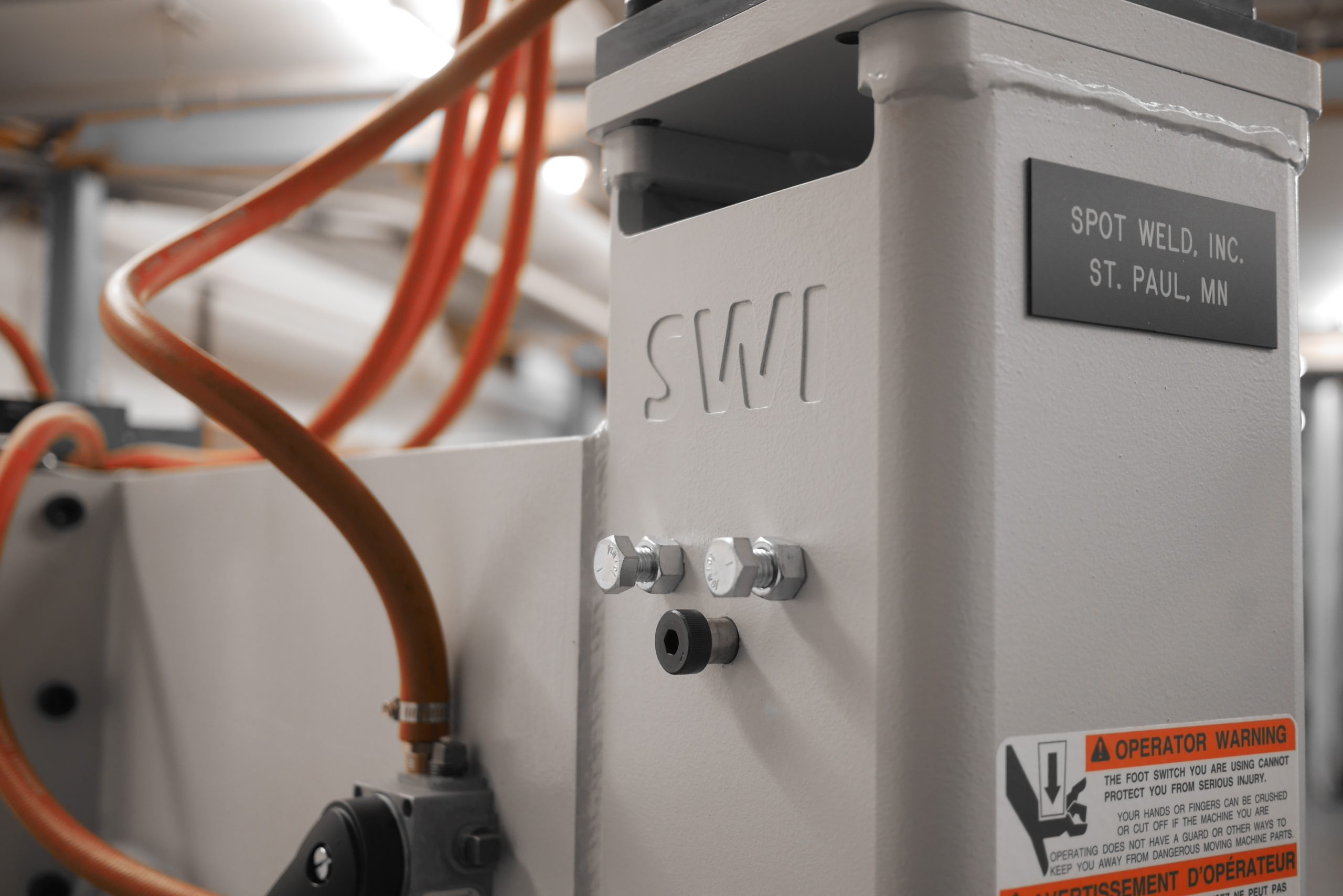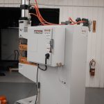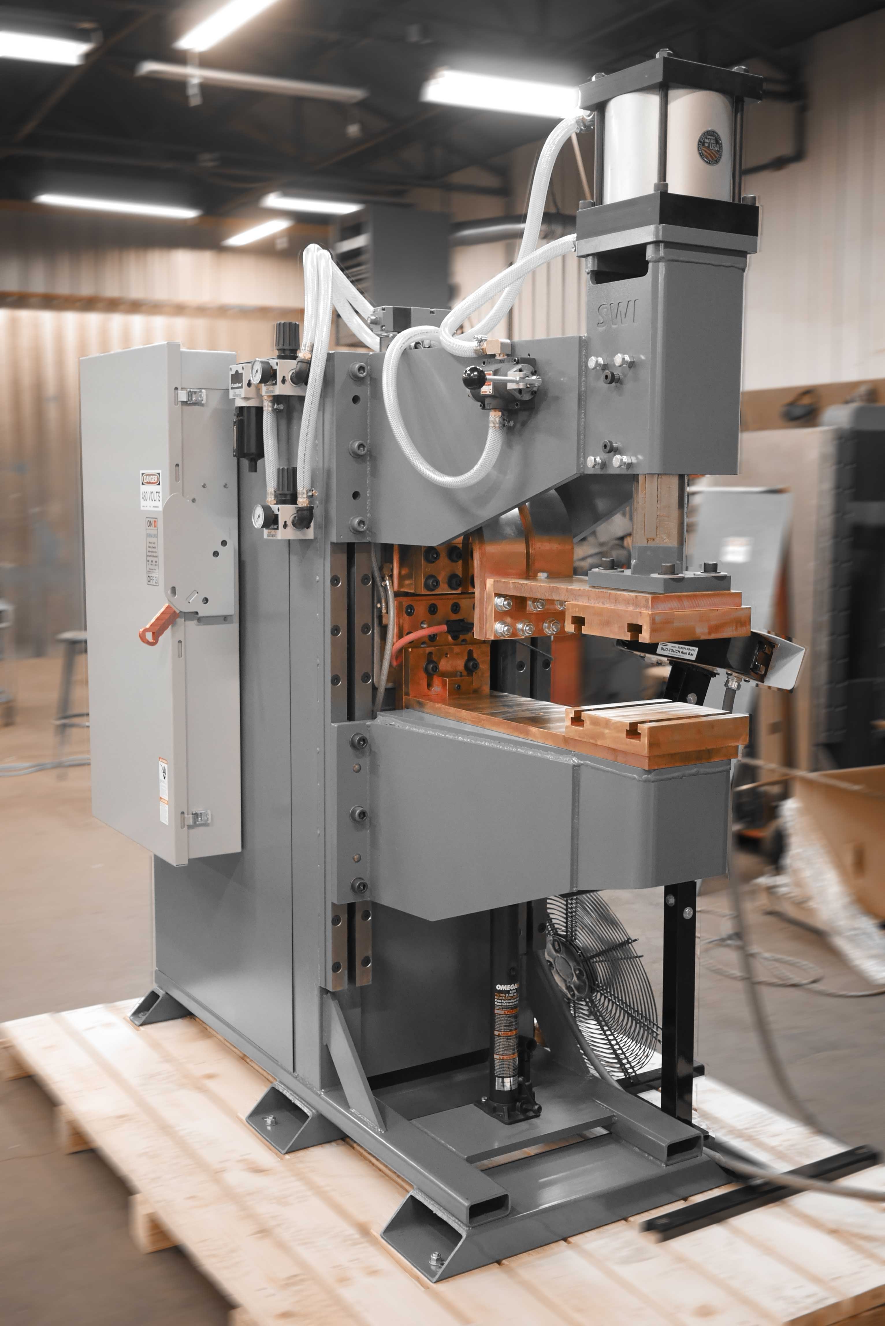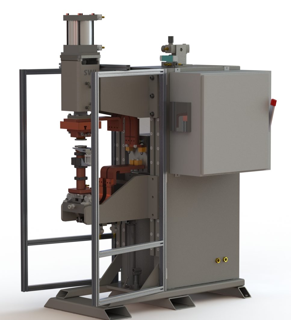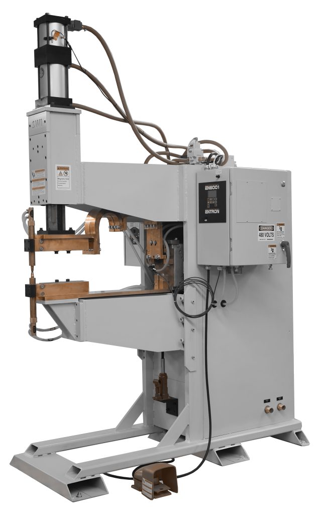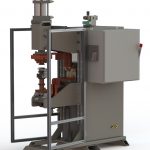 A “Projection Welder” is so named because many metal stampings will use weld “projections” on the part to enable multiple welds at once, or to ensure a quality weld. To weld multiple welds at a time typically takes more weld force than a traditional spot weld, so a more robust frame is required to prevent flex with the higher forces. Spot Weld’s Projection Welder uses the same robust cam-follower ram design as the rest of our line of press style welders.