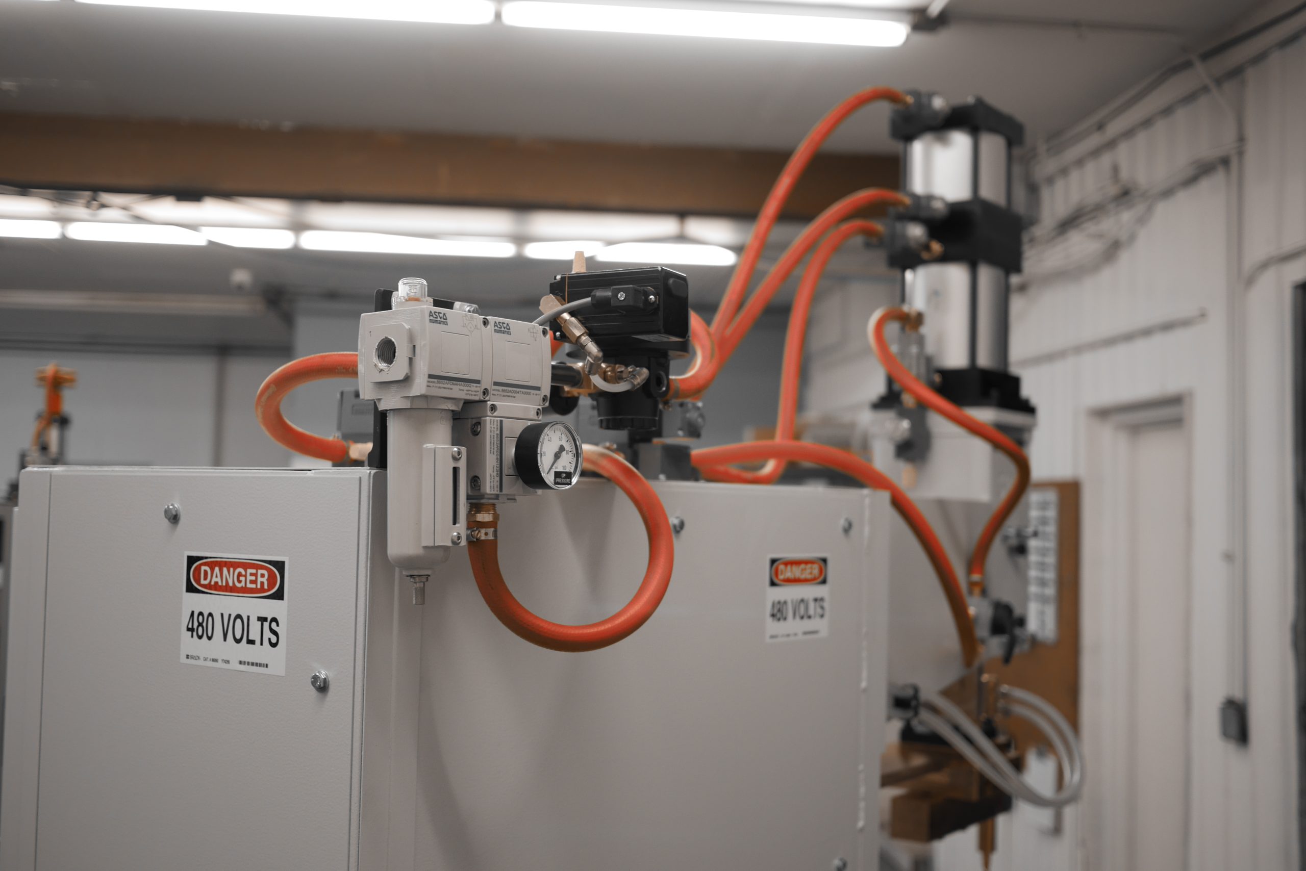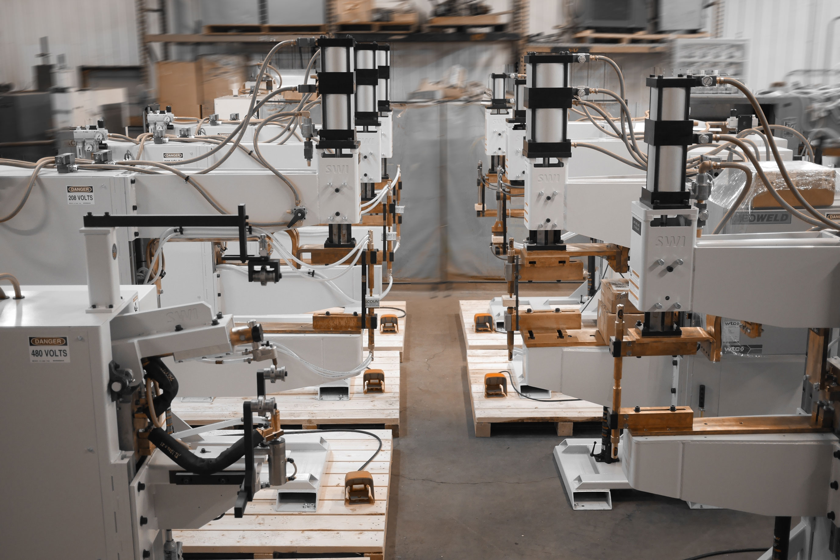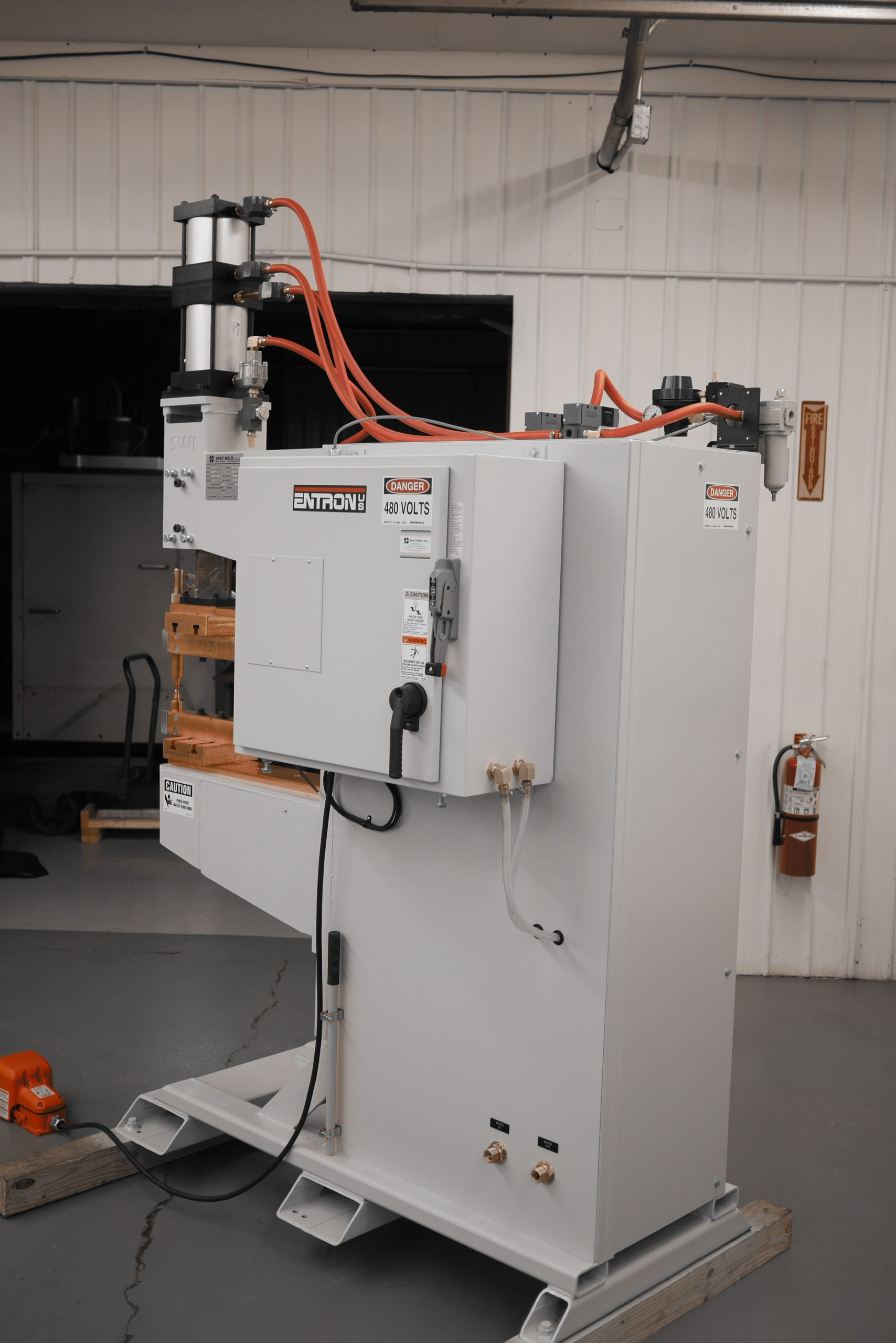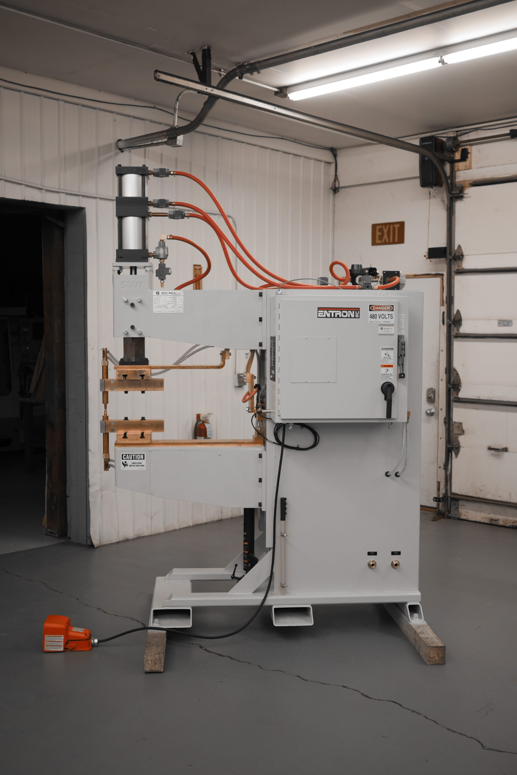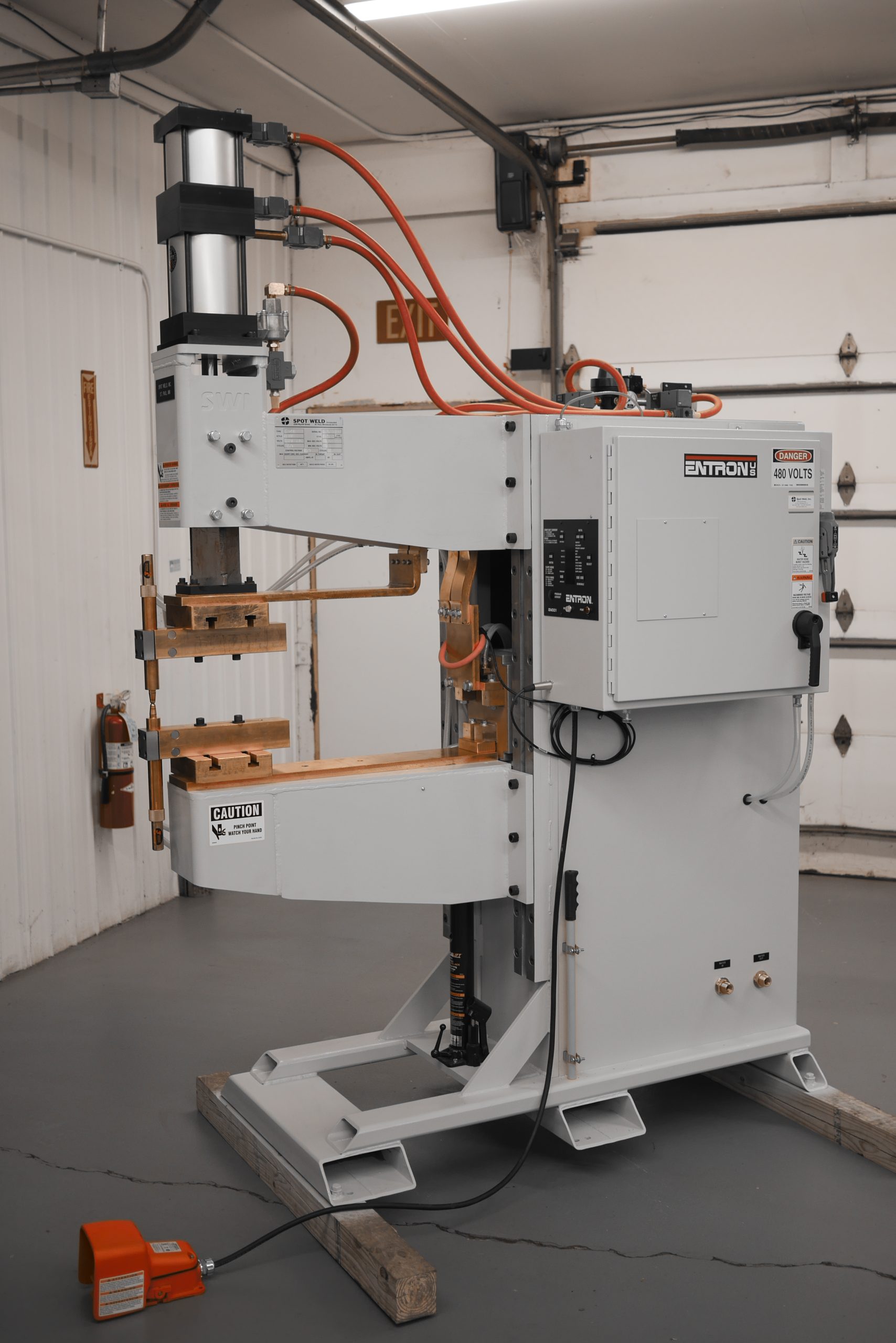 A “Projection Welder” is so named because many metal stampings will use weld “projections” on the part to enable multiple welds at once, or to ensure a quality weld. To weld multiple welds at a time typically takes more weld force than a traditional spot weld, so a more robust frame is required to prevent flex with the higher forces. Spot Weld’s Projection Welder uses the same robust cam-follower ram design as the rest of our line of press style welders.